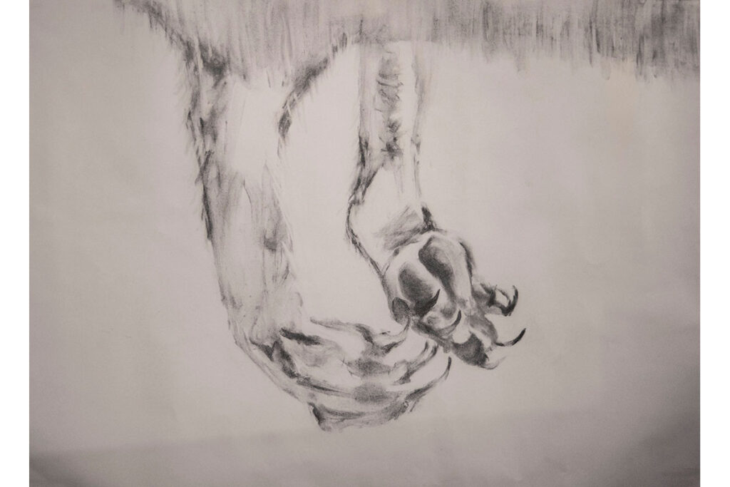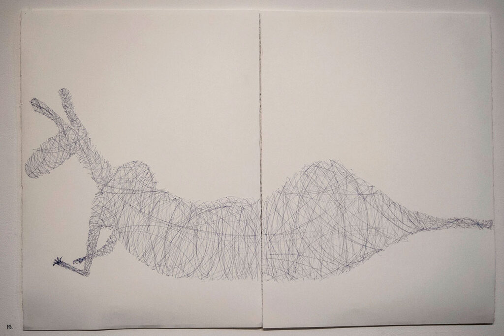 Alone in Tapatjatjaka Arts Centre, central Australia, I wandered around allowing the art works to seep into me. What struck me was a sense of connectedness embedded in the works---people, landscape, and animals, they all belonged together, were part of each other. There was a collection of kangaroo sculptures (Johnny Young) had made, out of copper wire; the wrapping and tangling of the wire creating the kangaroo forms. I tried drawing these kangaroos, drawing from the sculptures, understanding and feeling the form through the wire wrapping. This brought me back to my own personal relationship to the kangaroo, how it continues to reside in my psyche and affects my identity and sense of belonging.