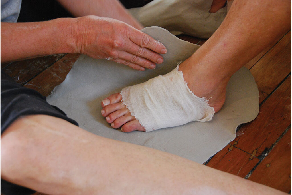 Touch this earth lightly started in the Hunter Valley NSW in 2009 when it was proposed to dam the Williams River. Antagonism between those for and those against the proposal was palpable in the streets and undermined community life. I was living and working in the area. Not from or of, I didn’t want to speak out, but I did want to explore and share people’s stories of belonging and attachment to place. I started wrapping people’s feet in clay and recording their stories. It was like a bundle of entwined ropes. As I sat at a person’s feet massing oil into them, wrapping them in gauze, and then the cool clay; I was loosening a thread. Stories emerged, voices soft at first, then gathering strength and momentum. Stories often full of childhood memories, camping, bushwalking, playing in the mud and rivers; memories of rituals both public and private, and the solace of the natural world, scored on the feet and minds of individuals.