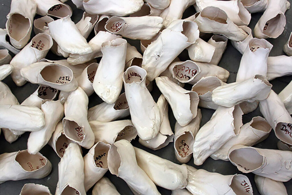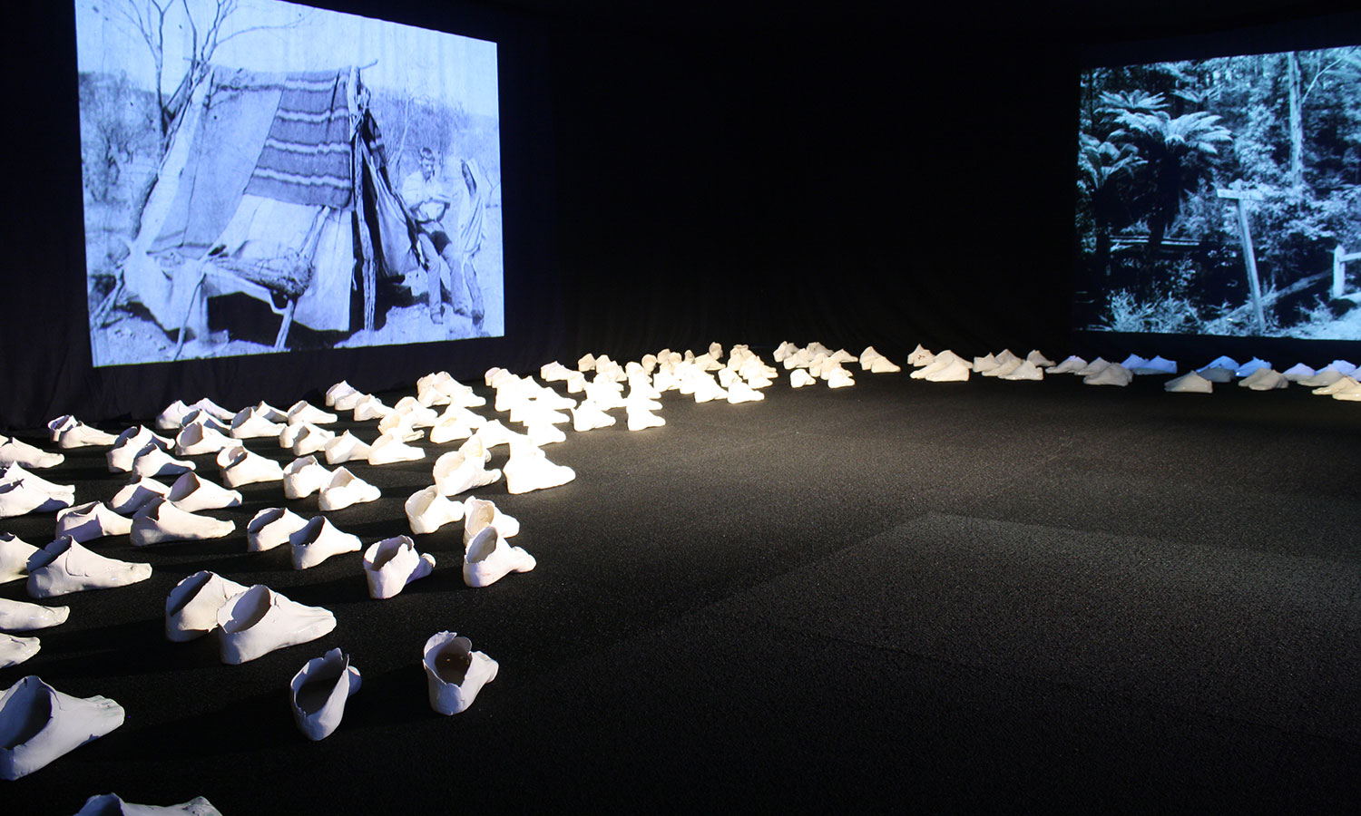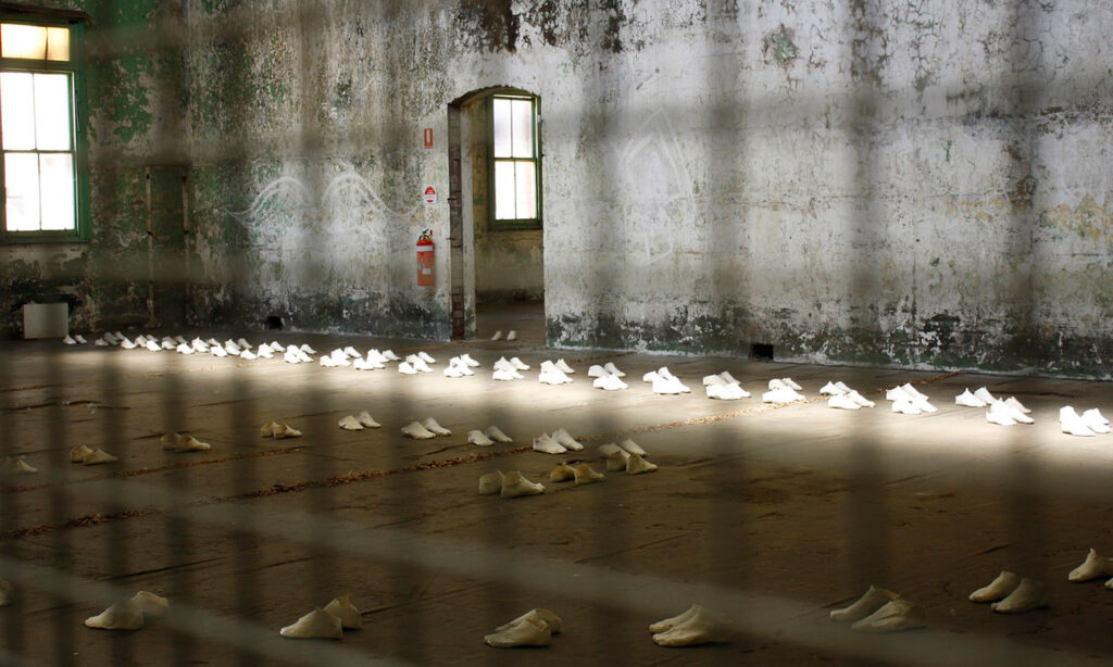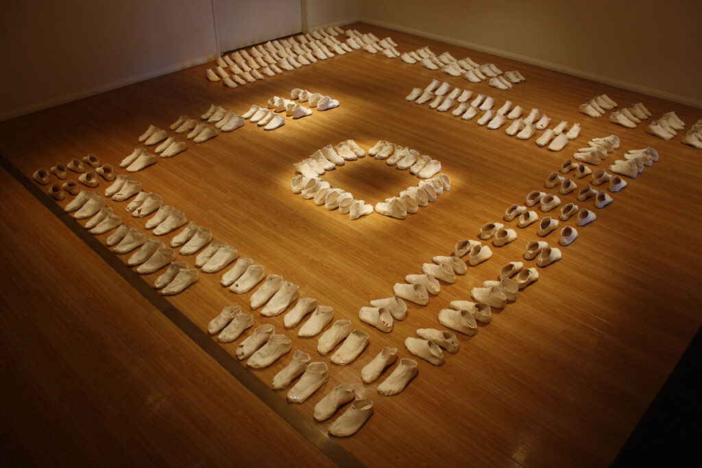 For 10 years, I roamed Australia seeking out places of difference. I worked in fits and starts as I didn’t want to seek funding that would colour the way in which people perceived the project. People would ask me, “is a mining company paying for community engagement? Are you a greenie?” Residencies provided a neutral place to set up a base and resources to help with firing the shoes. I have collected 986 pairs of clay shoes and stories. Installations have taken place in vacant shops, galleries, a museum, in a custom-made black box within a basketball court - as part of a festival. I stopped making in 2019, full of stories, emotions, ideas, and a far deeper understanding of connection to place.